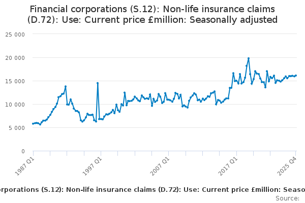 Download this time seriesFinancial corporations (S.12): Non-life insurance claims (D.72): Use: Current price £million: Seasonally adjusted