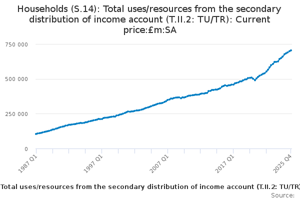Download this time seriesHouseholds (S.14): Total uses/resources from the secondary distribution of income account (T.II.2: TU/TR): Current price:£m:SA