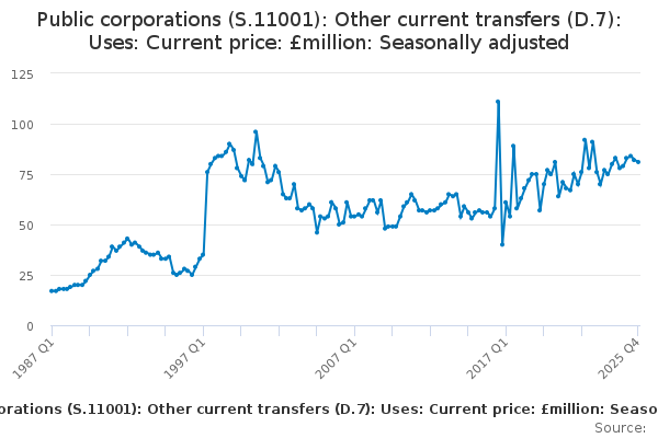 Download this time seriesPublic corporations (S.11001): Other current transfers (D.7): Uses: Current price: £million: Seasonally adjusted