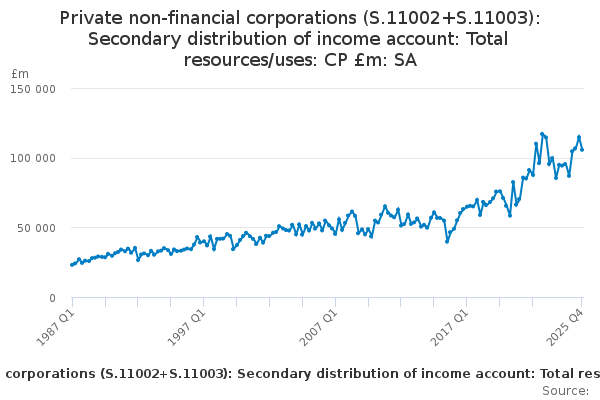 Download this time seriesPrivate non-financial corporations (S.11002+S.11003): Secondary distribution of income account: Total resources/uses: CP £m: SA