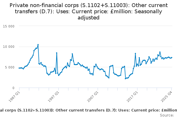 Download this time seriesPrivate non-financial corps (S.1102+S.11003): Other current transfers (D.7): Uses: Current price: £million: Seasonally adjusted