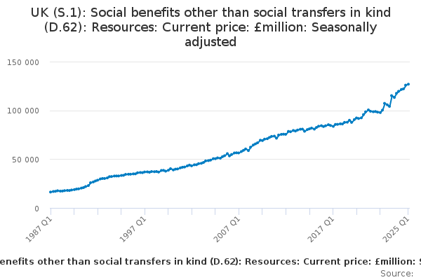 Download this time seriesUK (S.1): Social benefits other than social transfers in kind (D.62): Resources: Current price: £million: Seasonally adjusted