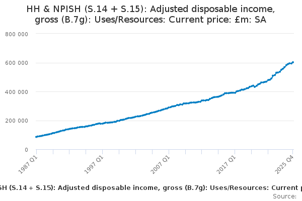 Download this time seriesHH & NPISH (S.14 + S.15): Adjusted disposable income, gross (B.7g): Uses/Resources: Current price: £m: SA