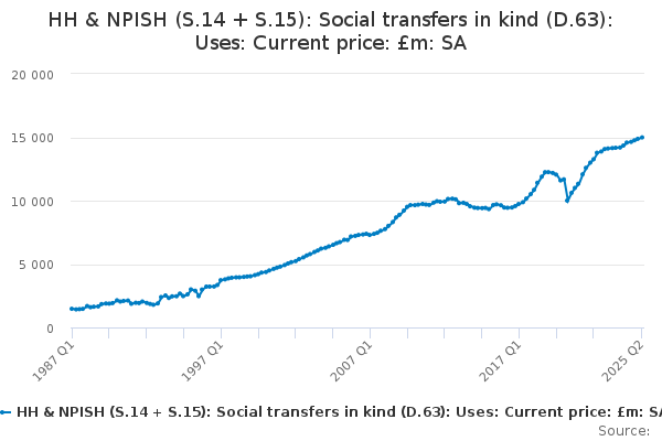 Download this time seriesHH & NPISH (S.14 + S.15): Social transfers in kind (D.63): Uses: Current price: £m: SA