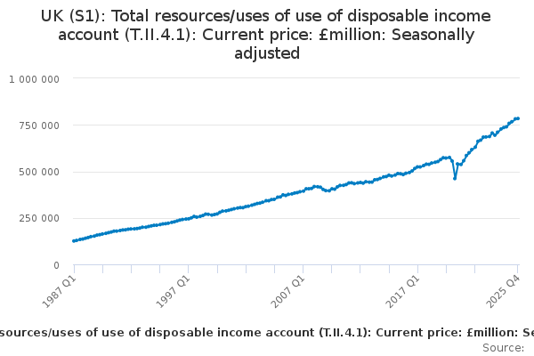Download this time seriesUK (S1): Total resources/uses of use of disposable income account (T.II.4.1): Current price: £million: Seasonally adjusted