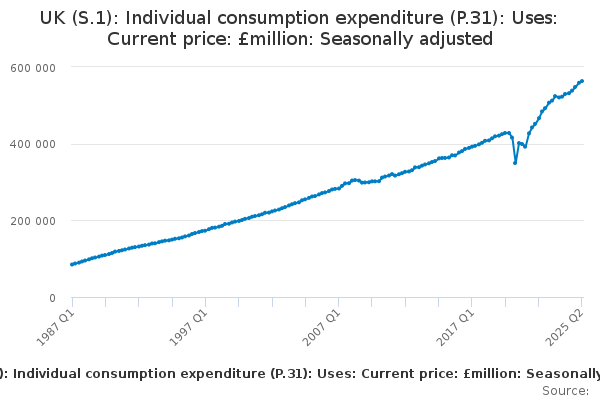 Download this time seriesUK (S.1): Individual consumption expenditure (P.31): Uses: Current price: £million: Seasonally adjusted