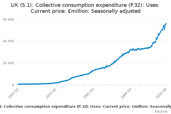 Download this time seriesUK (S.1): Collective consumption expenditure (P.32): Uses: Current price: £million: Seasonally adjusted