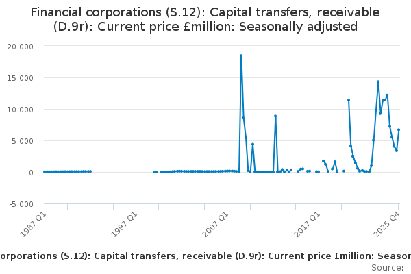 Download this time seriesFinancial corporations (S.12): Capital transfers, receivable (D.9r): Current price £million: Seasonally adjusted
