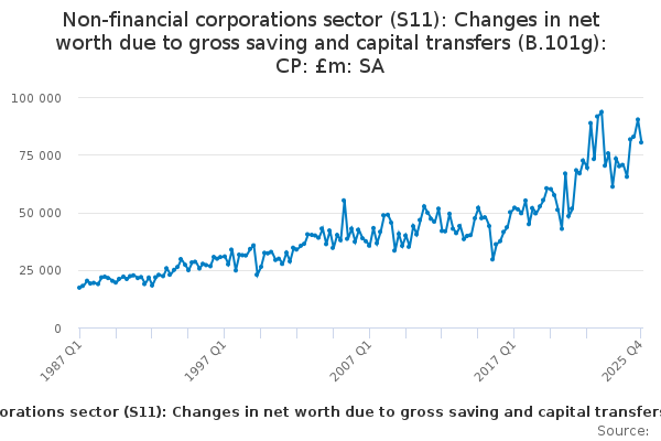 Download this time seriesNon-financial corporations sector (S11): Changes in net worth due to gross saving and capital transfers (B.101g): CP: £m: SA