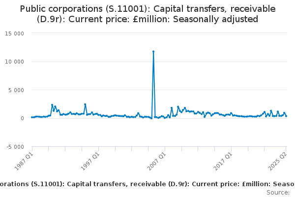 Download this time seriesPublic corporations (S.11001): Capital transfers, receivable (D.9r): Current price: £million: Seasonally adjusted