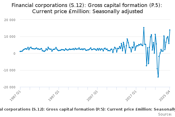 Download this time seriesFinancial corporations (S.12): Gross capital formation (P.5): Current price £million: Seasonally adjusted