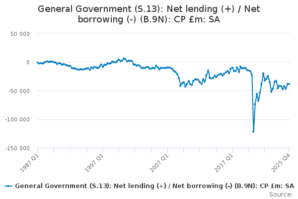 Download this time seriesGeneral Government (S.13): Net lending (+) / Net borrowing (-) (B.9N): CP £m: SA