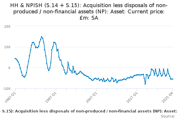 Download this time seriesHH & NPISH (S.14 + S.15): Acquisition less disposals of non-produced / non-financial assets (NP): Asset: Current price: £m: SA
