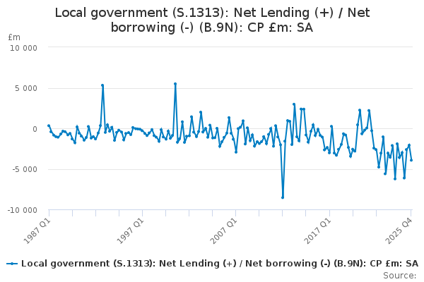 Download this time seriesLocal government (S.1313): Net Lending (+) / Net borrowing (-) (B.9N): CP £m: SA