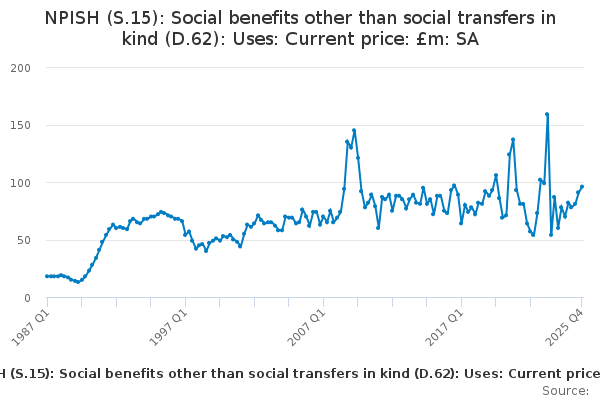 Download this time seriesNPISH (S.15): Social benefits other than social transfers in kind (D.62): Uses: Current price: £m: SA