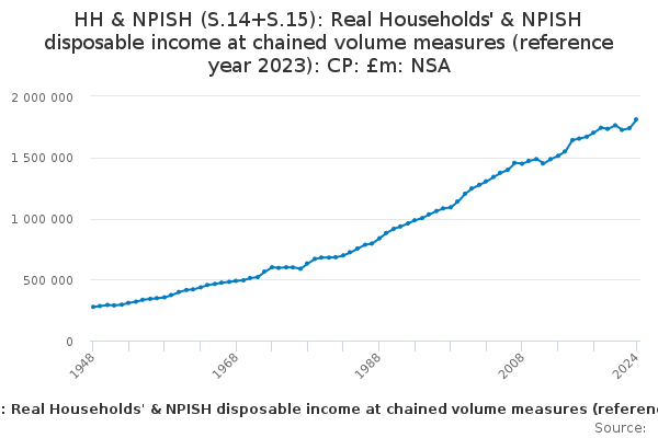 Download this time seriesHH & NPISH (S.14+S.15): Real Households' & NPISH disposable income at chained volume measures (reference year 2023): CP: £m: NSA