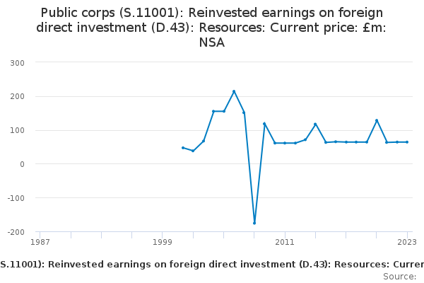 Download this time seriesPublic corps (S.11001): Reinvested earnings on foreign direct investment (D.43): Resources: Current price: £m: NSA