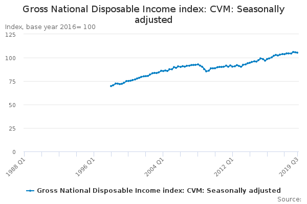 ONS identified a processing error that caused Households Individual consumption expenditure (ABJQ) to be incorrect in the quarterly, current price, seasonally adjusted data for 1985 Q1 to 1986 Q4 published in tables 1.1.2, 6.2.6 and 6.2.12. This also affected Household Final Consumption Expenditure per head (CRXO) in table 1.1.5. The update has resulted in a small error to households’ gross saving of -0.01% which will be corrected in Blue Book 2019.