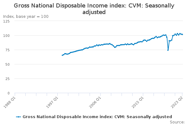 CRXB – Real households and non-profit institutions serving households (S.14 + S.15) expenditure implied deflator: Index (Reference year 2016): Not seasonally adjusted YBFS – Real households and non-profit institutions serving households (S.14 + S.15) expenditure implied deflator: Index (Reference year 2016): Seasonally adjusted CRXA – Real households (S.14) expenditure implied deflator: Index (Reference year 2016): Not seasonally adjusted DG2Q – Real households (S.14) expenditure implied deflator: Index (Reference year 2016): Seasonally adjusted CSC8 - Real households (S.14) expenditure implied deflator: Y/Y-1 growth percent: Seasonally adjusted CSEZ - Real households (S.14) expenditure implied deflator: Q/Q-1 growth percent: Seasonally adjusted CSGE - Real households (S.14) expenditure implied deflator: Q/Q-4 percent: Seasonally adjusted CSK9 – Cash Basis Real Households (S.14) Expenditure implied deflator: Index (ref year = 2016): Seasonally adjusted CSJ6 - CASH BASIS Real Households (S.14) disposable income: £Million: Seasonally adjusted CSJ7 – CASH BASIS Real Households (S.14) disposable income: growth t/t-1 percent: Seasonally adjusted CSK4 – CASH BASIS Real Households (S.14) disposable income: growth t/t-4 percent: Seasonally adjusted CSK2 – CASH BASIS Real households (S.14) disposable income: Per head £: SA Seasonally adjusted CSK3 – CASH BASIS Real households (S.14) disposable income: Per head growth t/t-1 percent: Seasonally adjusted CT3K – CASH BASIS Real households (S.14) disposable income: Per head growth t/t-1 percent: Seasonally adjusted