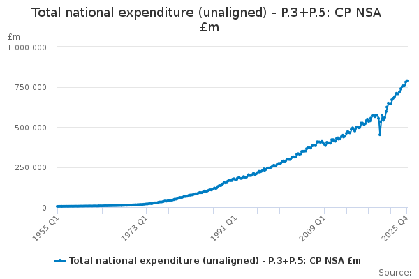 Download this time seriesTotal national expenditure (unaligned) - P.3+P.5: CP NSA £m