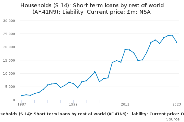 Download this time seriesHouseholds (S.14): Short term loans by rest of world (AF.41N9): Liability: Current price: £m: NSA
