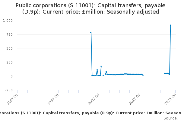 Download this time seriesPublic corporations (S.11001): Capital transfers, payable (D.9p): Current price: £million: Seasonally adjusted