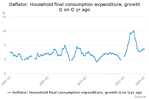 Download this time seriesDeflator: Household final consumption expenditure, growth Q on Q yr ago