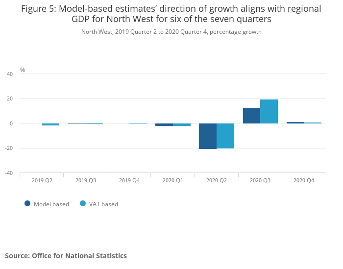 Figure 5: Model-based estimates’ direction of growth aligns with regional GDP for North West for six of the seven quarters
