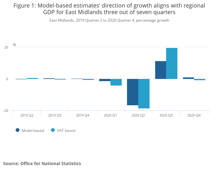 Figure 1: Model-based estimates’ direction of growth aligns with regional GDP for East Midlands three out of seven quarters