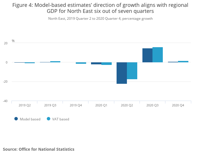 Figure 4: Model-based estimates’ direction of growth aligns with regional GDP for North East six out of seven quarters