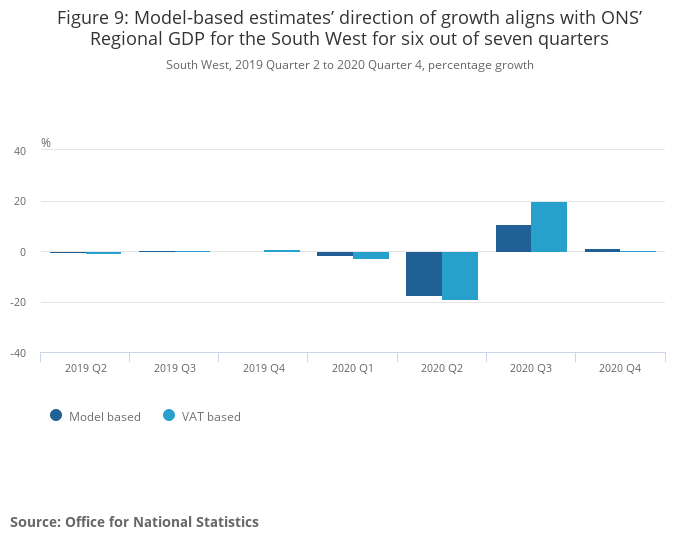 Figure 9: Model-based estimates’ direction of growth aligns with ONS’ Regional GDP for the South West for six out of seven quarters