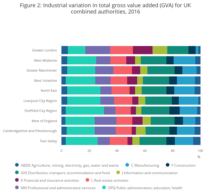 In 2016, in current basic prices, all combined authorities have increased, with the strongest growth in the West of England at 5.5%; the lowest growth was in Tees Valley at 0.1%.