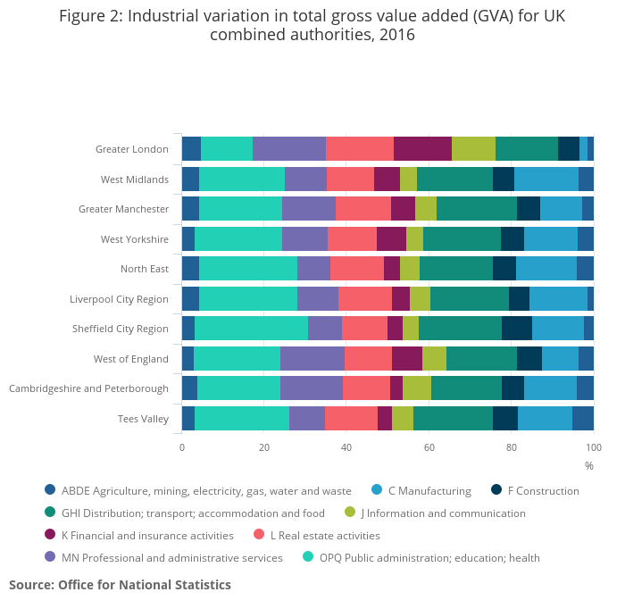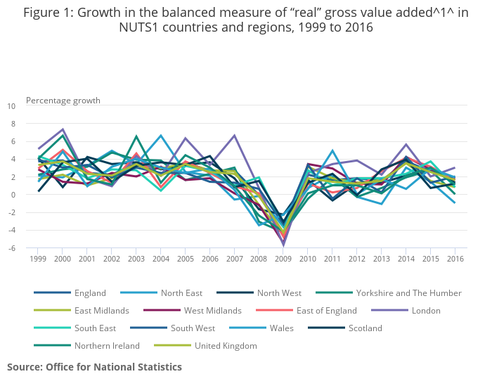 In 2016, GVA for the UK, in chained volume measures, increased by 1.6%; the highest annual “real” growth of NUTS1 areas was in London at 3.0% and the lowest annual growth was in the North East at negative 1.0%.