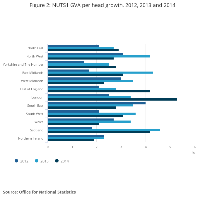 In 2014 Gross Value Added (GVA) per head of population increased in all NUTS1 regions. The highest annual growth was in London at 5.3% and the lowest annual growth was in Northern Ireland at 1.9%