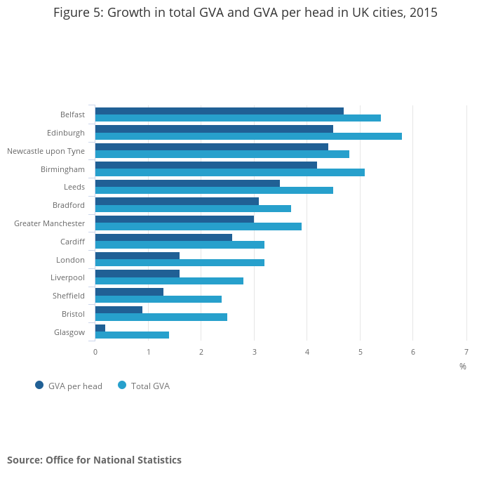 The capital cities of Belfast (4.7%) and Edinburgh (4.5%) were showing the strongest annual growth in GVA per head in 2015, outstripping Cardiff (2.6%) and London (1.6%).