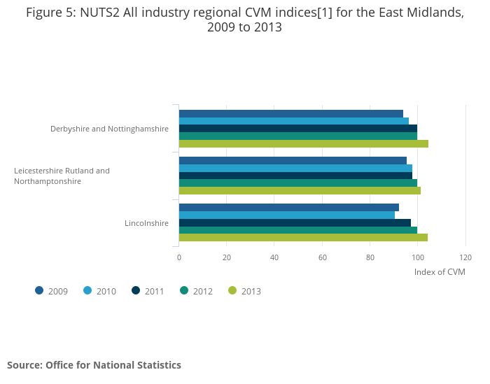 Figure 5: NUTS2 All industry regional CVM indices[1] for the East Midlands, 2009 to 2013