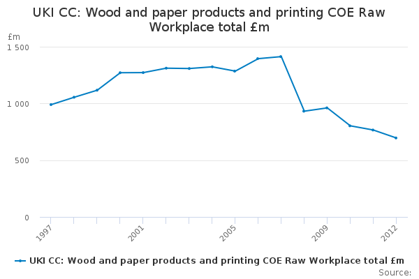Download this time seriesUKI CC: Wood and paper products and printing COE Raw Workplace total £m