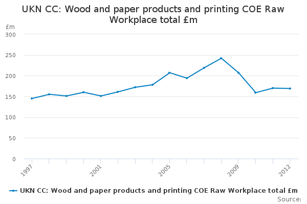 Download this time seriesUKN CC: Wood and paper products and printing COE Raw Workplace total £m