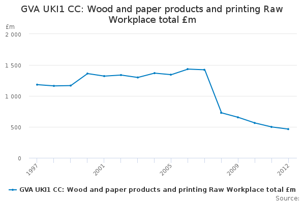 Download this time seriesGVA UKI1 CC: Wood and paper products and printing Raw Workplace total £m