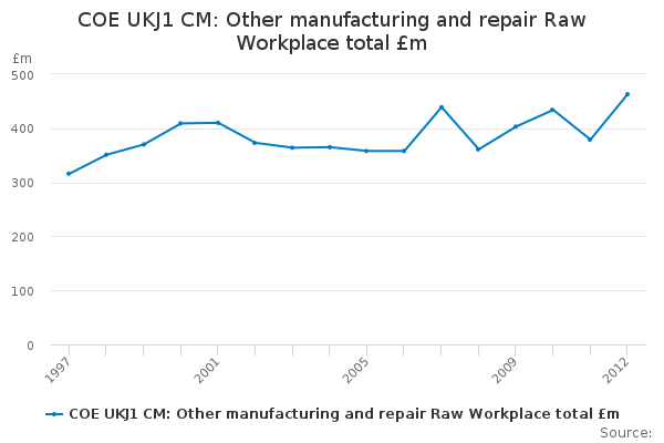 Download this time seriesCOE UKJ1 CM: Other manufacturing and repair Raw Workplace total £m