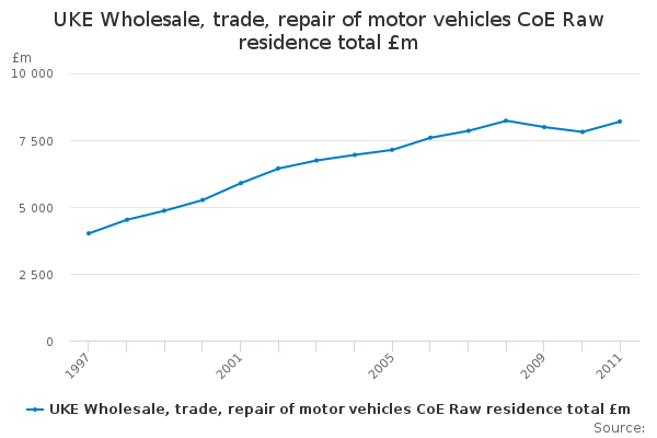Download this time seriesUKE Wholesale, trade, repair of motor vehicles CoE Raw residence total £m