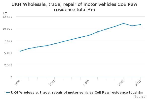 Download this time seriesUKH Wholesale, trade, repair of motor vehicles CoE Raw residence total £m