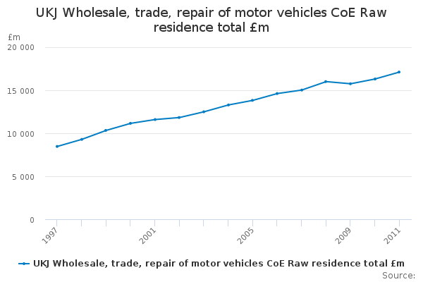 Download this time seriesUKJ Wholesale, trade, repair of motor vehicles CoE Raw residence total £m