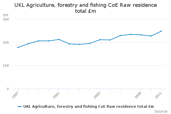 Download this time seriesUKL Agriculture, forestry and fishing CoE Raw residence total £m