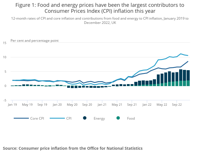 12-month rates of CPI and core inflation and contributions from food and energy to CPI inflation, January 2019 to December 2022, UK