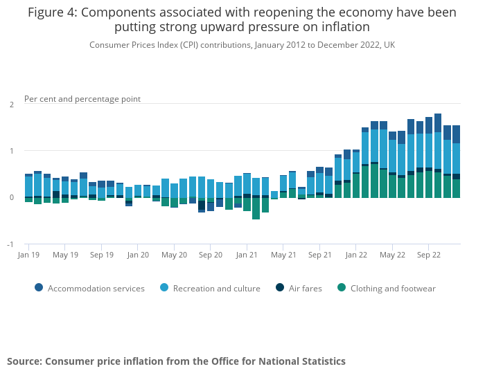 Coronavirus (COVID-19) restrictions were in place for periods through 2020 and 2021, particularly on the hospitality and retail industries in the UK. Border restrictions were also in place, which had an impact on international travel. As these restrictions were lifted, there was an increase in demand for these goods and services. The components considered to be particularly affected by the reopening of the economy include clothing and footwear, recreation and culture, accommodation services, and air fares. As restrictions lifted and the economy began to reopen, the contributions from these components rose sharply (Figure 4).