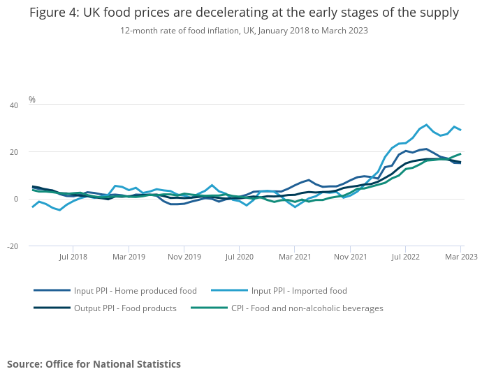 Figure 4: UK food prices are decelerating at the early stages of the supply