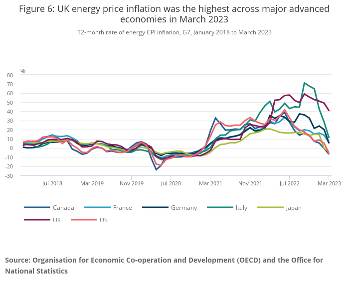 The 12-month rate of energy price inflation in the UK was the highest among G7 economies in March 2023, which compares with single-digit energy price inflation in most major European economies and declining energy prices in US and Canada; the regulation of utility prices in the UK explain why consumer prices were slower to react to changes in wholesale gas prices.
