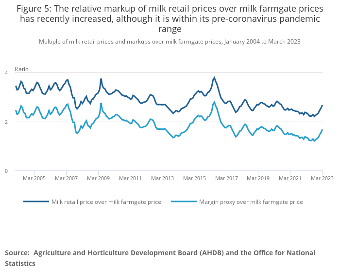 Figure 5: The relative markup of milk retail prices over milk farmgate prices has recently increased, although it is within its pre-coronavirus pandemic range
