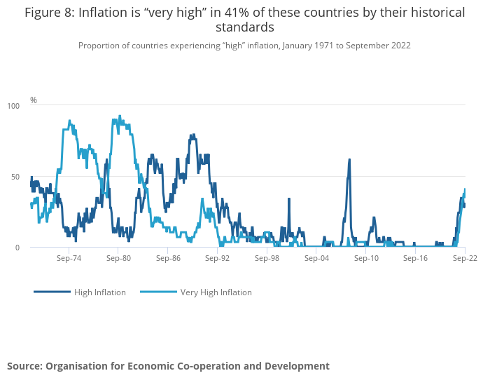 Over two-thirds (69%) of 29 countries have "high" or "very high" inflation compared with their 50-year trends; approximately three-quarters (79%) experienced 12-month Consumer Prices Index (CPI) inflation rates above 6% in September 2022, the most prevalent global inflation has been since 2008.